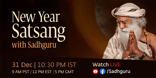 As one year comes to a close and another begins, what better way to step forward than in the presence of Sadhguru? | | | You are warmly invited to join an intimate New Year Satsang with Sadhguru, streamed live from the Isha Yoga Center Coimbatore. Immerse yourself in wisdom, stillness, joy, and a burst of exuberant energy as you bring 2025 to a graceful close and welcome 2026 with clarity. | | | Satsang with Sadhguru (Live) Date: 31 Dec 2025 Time: 10:30 PM IST | 9 AM PST | 12 PM EST | 5 PM GMT | | | The livestream will also be available in: | | | Feel free to invite family and friends who may wish to begin the new year in Sadhguru’s presence. | | | In love, light and laughter,, Isha Volunteers | | | | | © 2025 Sadhguru. Isha Yoga Center, Velliangiri Foothills, Ishana Vihar Post, Coimbatore, Tamil Nadu, Coimbatore – 641114 | | | |